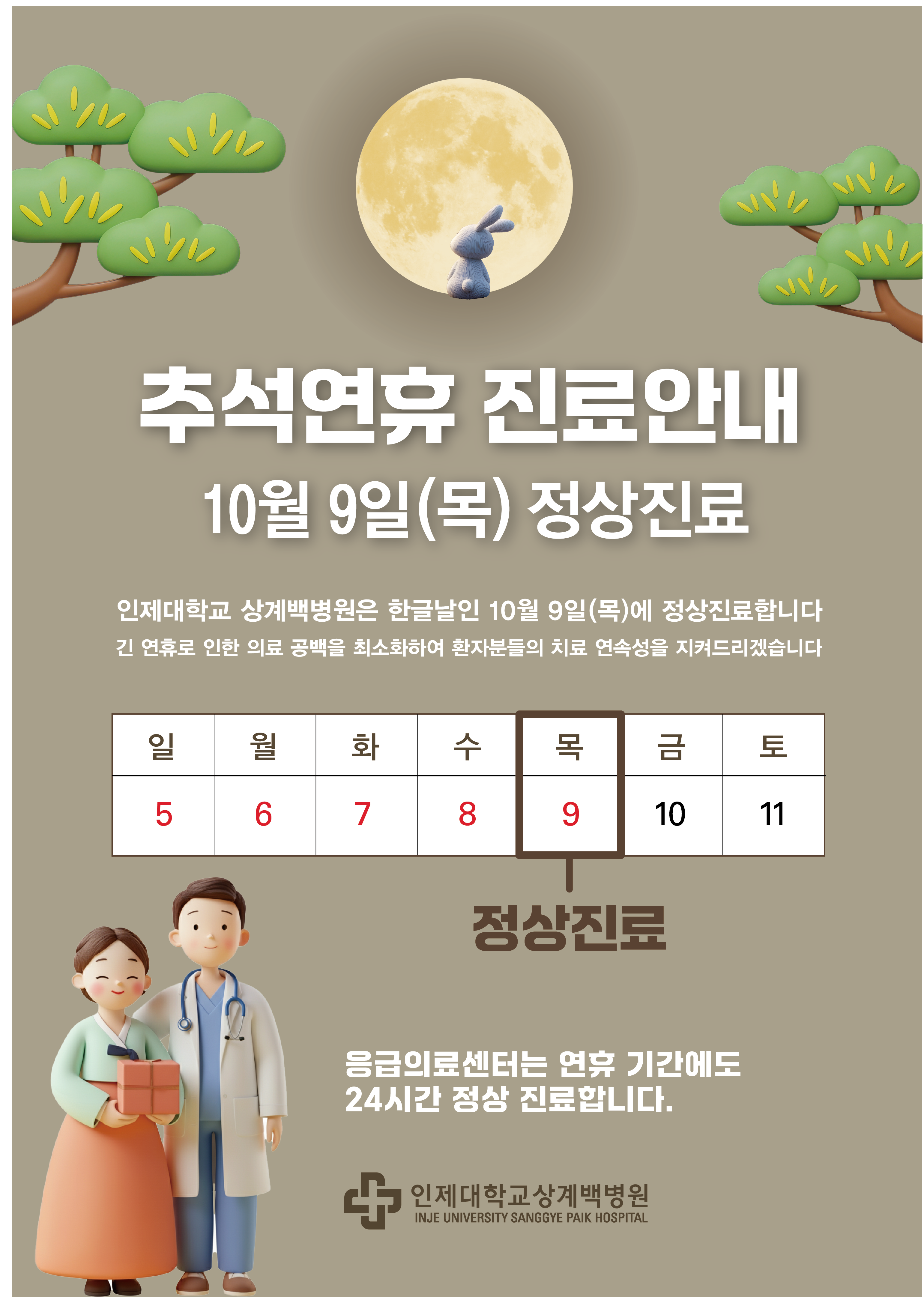 인제대학교 상계백병원은 10월 4일(토)과 한글날인 10월 9일(목)에 정상 진료합니다.