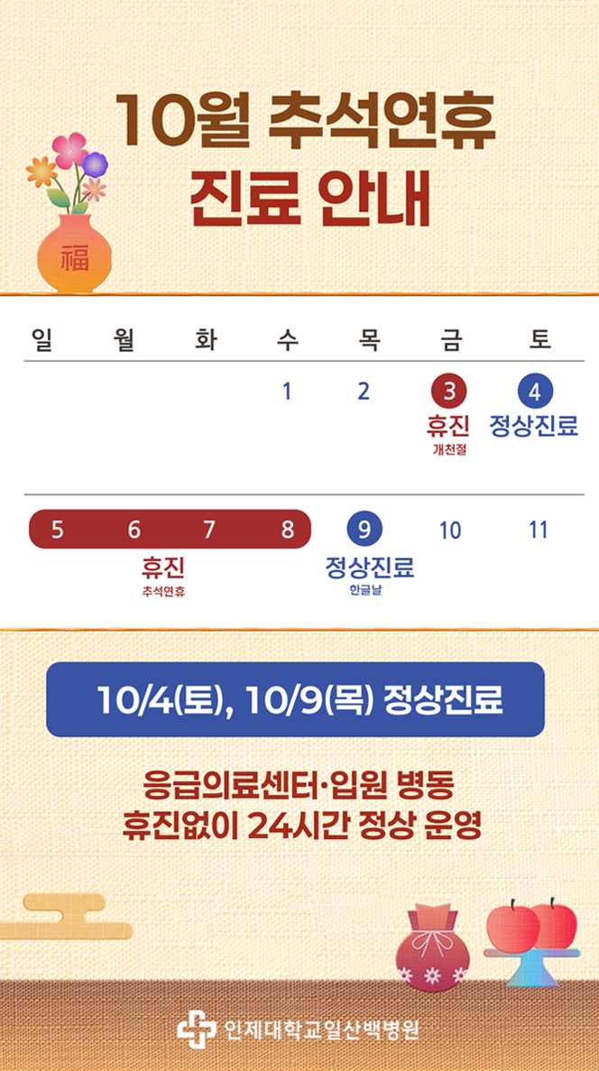 [공지] 일산백병원, 10월 9일(한글날) 정상진료 안내