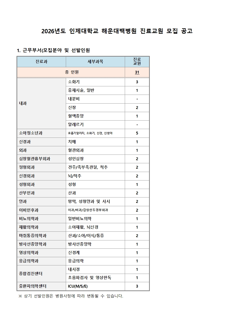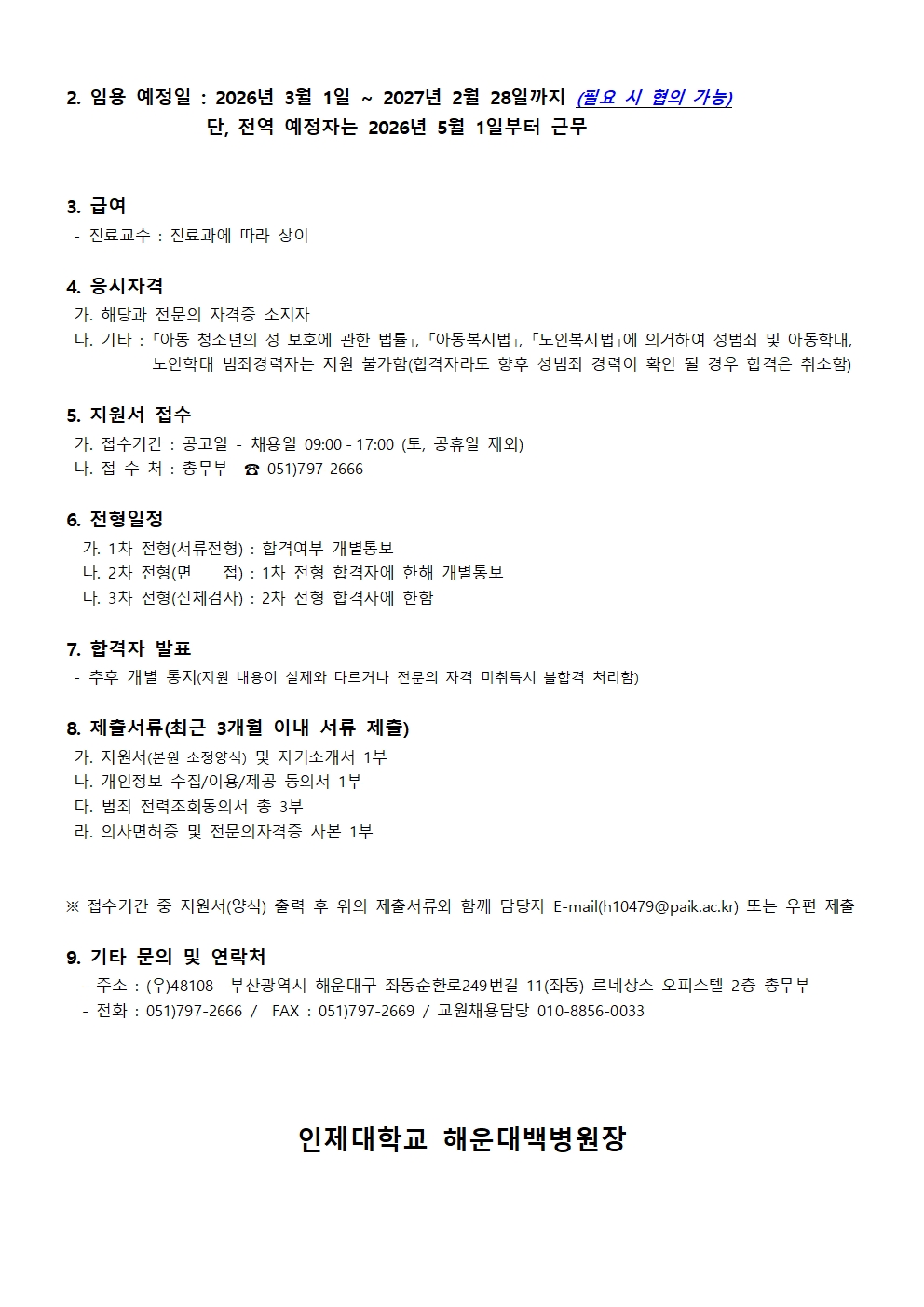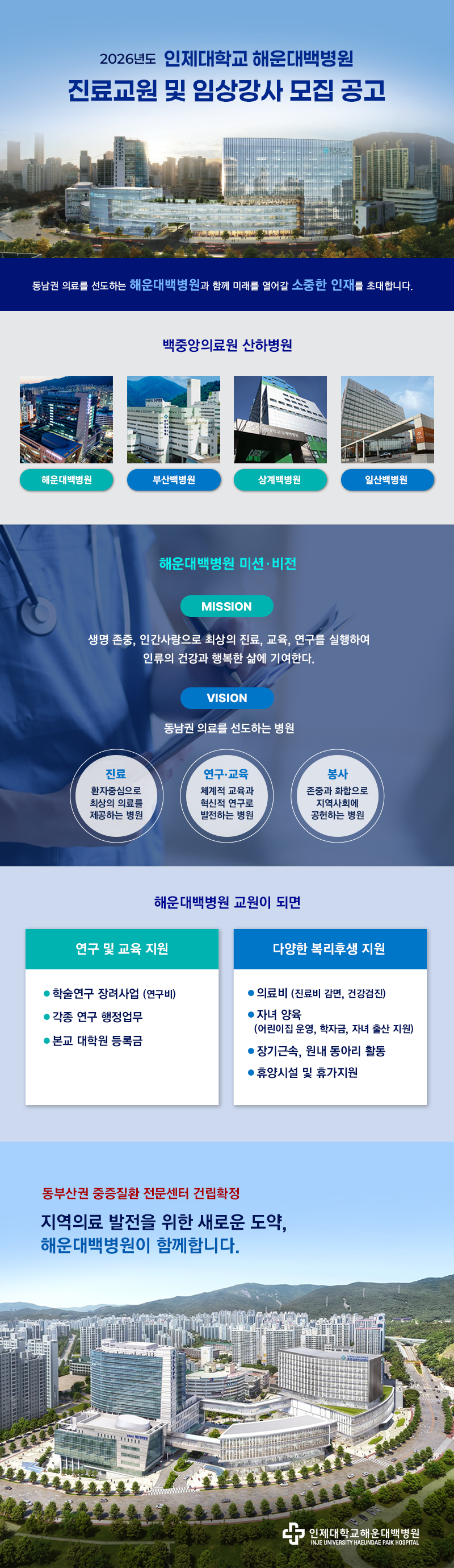 1652. [해운대백병원] 2026년도 해운대백병원 진료교원 모집 공고(재공고)