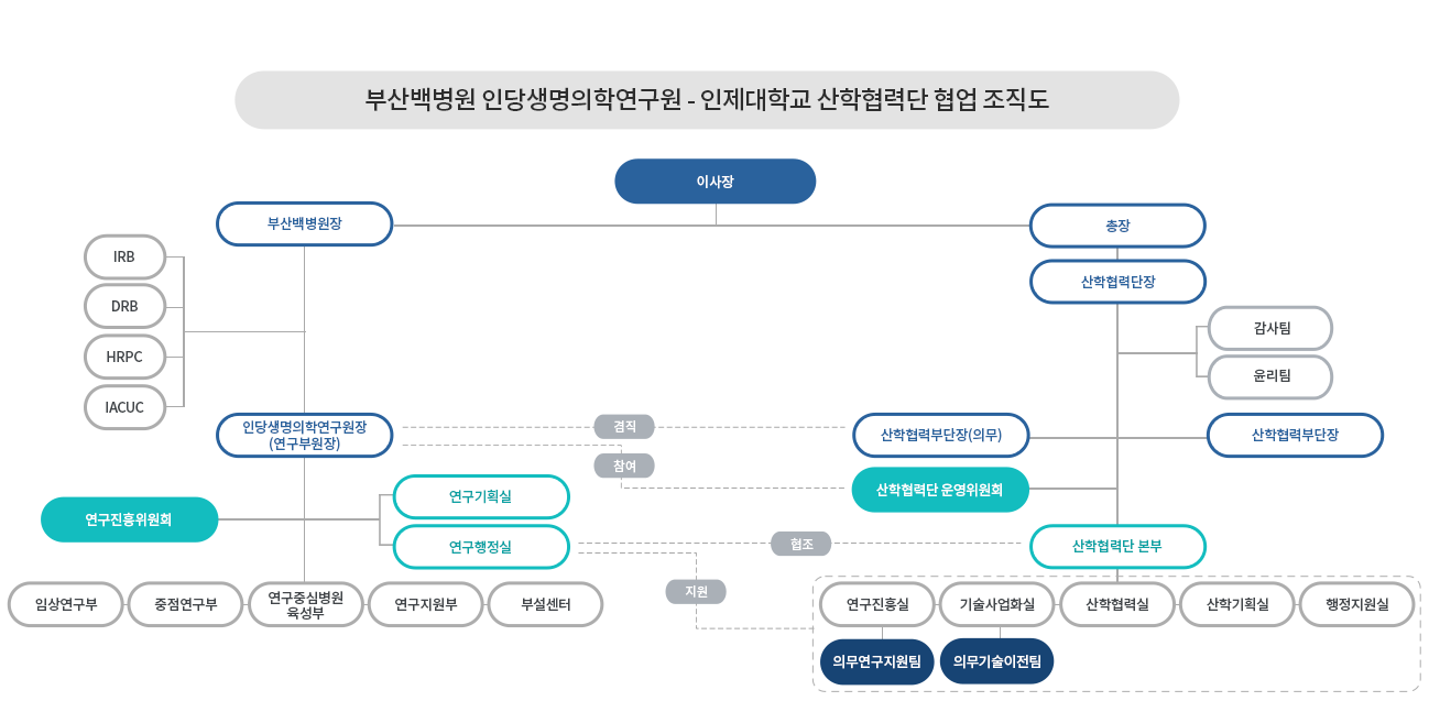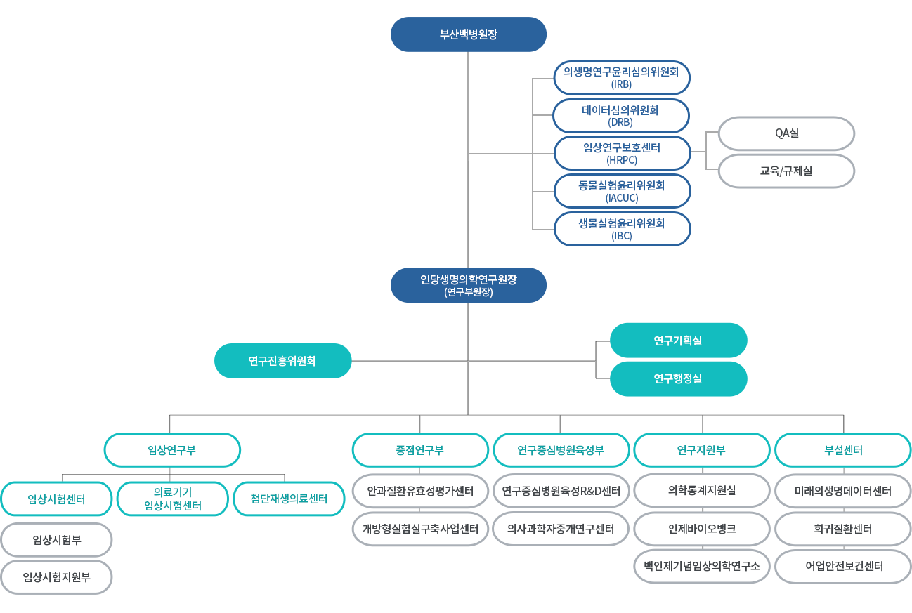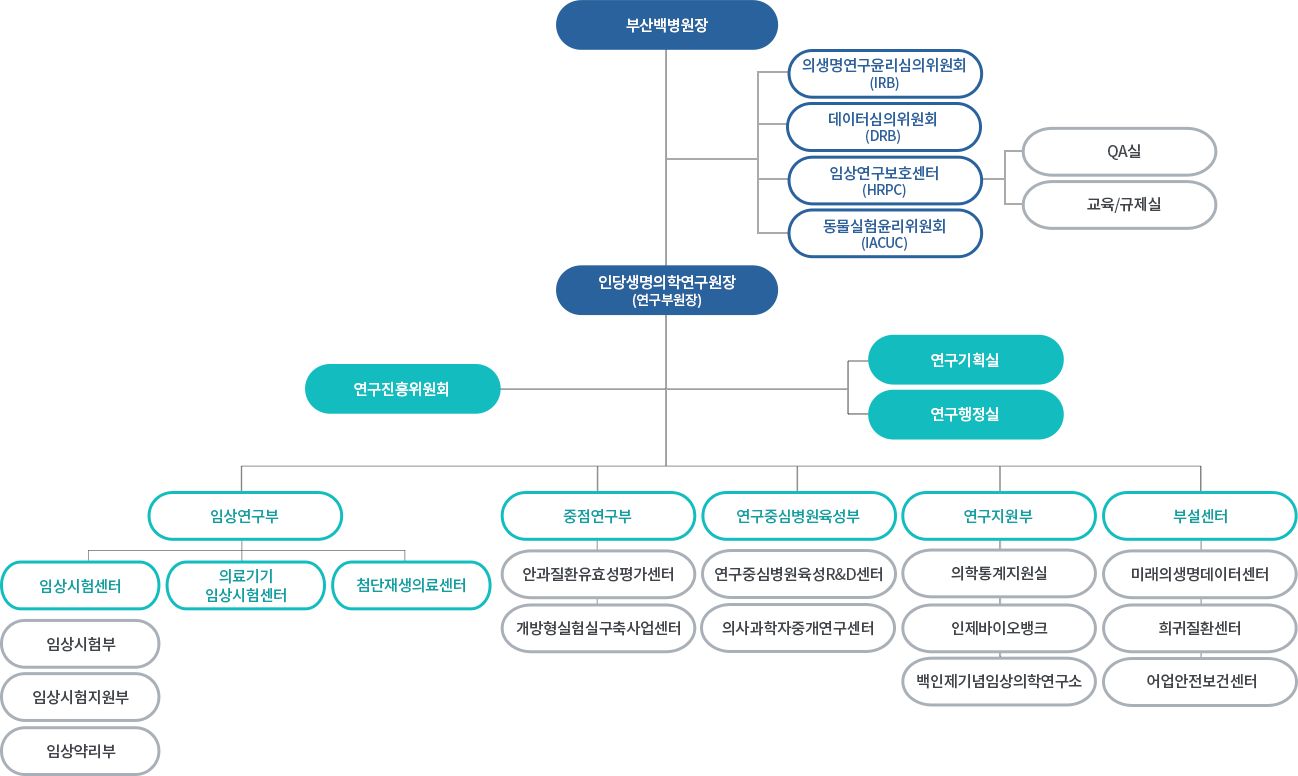 인당생명의학연구원은 1)임상시험센터와 의료기기 임상시험센터, 첨단재생의료센터를 포함한 임상연구부, 2) 안과질환유효성평가센터, 연구중심병원 육성R&D센터 등의 중점연구부, 3)기초의학교실과의 협력을 위한 기초중개부, 4) 미래의생명데이터센터, 희귀질환센터, 어업안전보건센터 등의 부설센터와 5)인제바이오뱅크, 의학통계지원실 등의 연구지원부로 구성되어 있으며, 연구행정실에서는 국가 R&D 과제 및 임상연구 과제 등의 신청, 계약 체결, 연구비 관리, 기술사업화 등 다양한 행정 업무를 지원하고 있습니다.