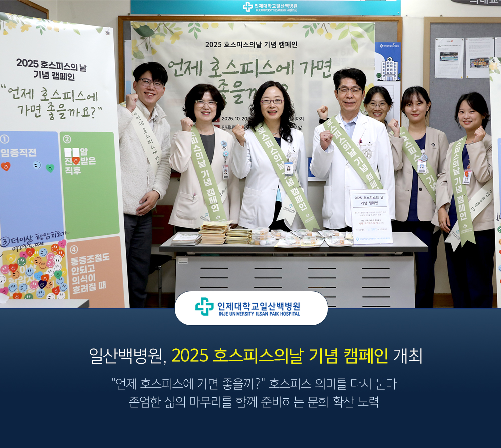 인제대학교 일산백병원 호스피스완화의료센터(센터장 이언숙)는 10월 20일 ‘언제 호스피스에 가면 좋을까요?’를 주제로 ‘2025 호스피스의날 기념 캠페인’을 개최했다.