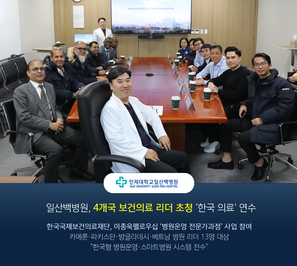 인제대학교 일산백병원(원장 최원주)은 한국국제보건의료재단(KOFIH)이 주관하는 이종욱펠로우십 ‘병원운영 전문가과정’에 참여해, 11월 16일부터 30일까지 4개국 보건의료 고위급 인사 13명을 대상으로 한국의 병원운영 및 스마트병원 시스템을 공유하는 연수를 진행한다.