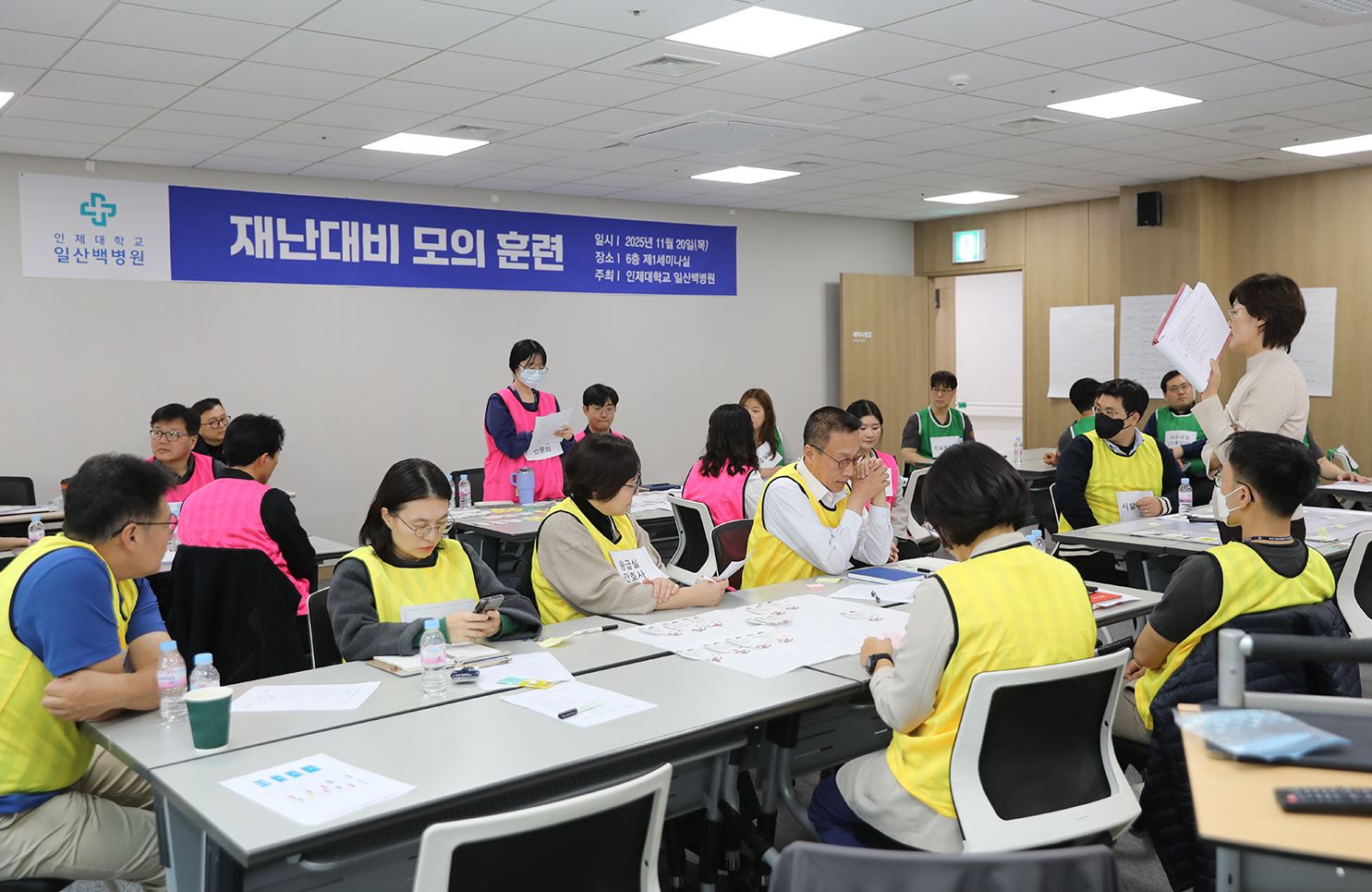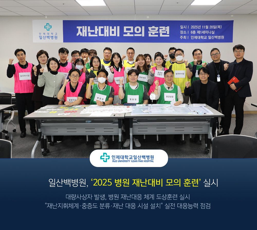 인제대학교 일산백병원은 11월 20일(목) 병원 6층 세미나실에서 ‘2025 병원 재난 대비 모의 훈련’을 진행했다. 이번 훈련은 대형 재난 발생 시 병원의 초기 대응 능력과 부서 간 협력체계를 점검하기 위한 목적으로 마련했다.