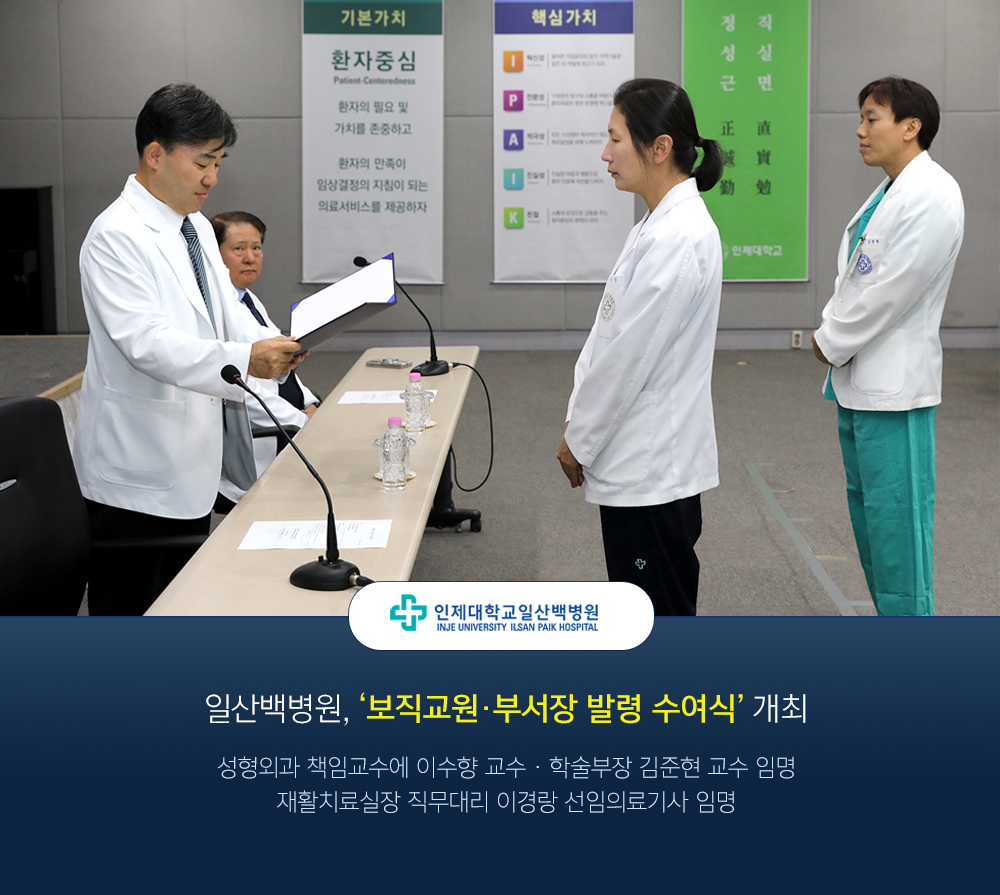 인제대학교 일산백병원은 2025년 12월 1일자 보직교원 및 부서장 인사를 단행했다. 12월 2일 열린 연석회의에서 최원주 원장이 인제학원 이사장과 인제의대 학장을 대신해 발령장과 임명장을 수여했다.