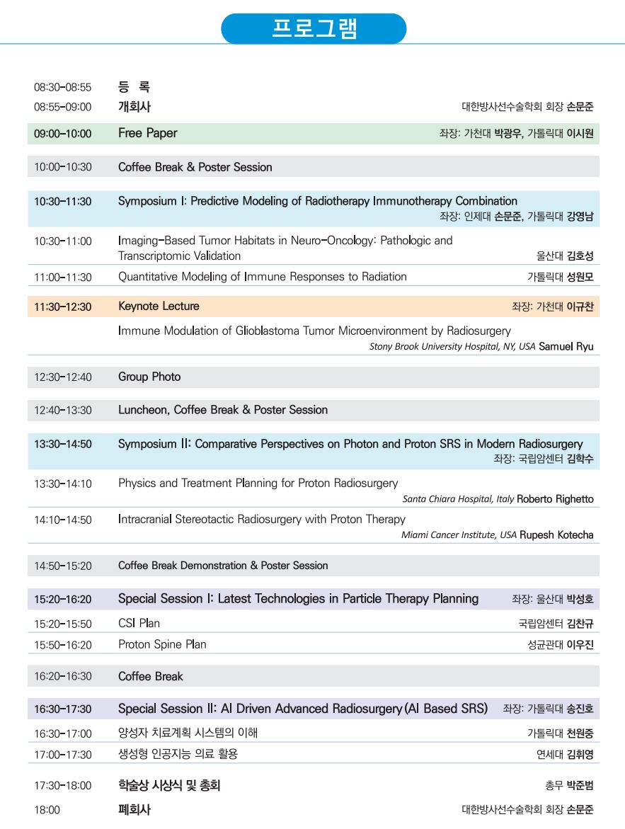 또한 ▲방사선치료와 면역반응 정량 모델링 ▲양성자 방사선수술 치료계획 ▲광자와 양성자 정위 방사선수술(SRS) 비교 ▲입자치료 최신 기술 ▲AI 기반 방사선수술 등 다양한 주제의 심포지엄을 개최할 예정이다.