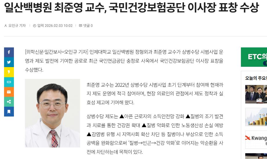 2025년 일산백병원 최다학술상 수상