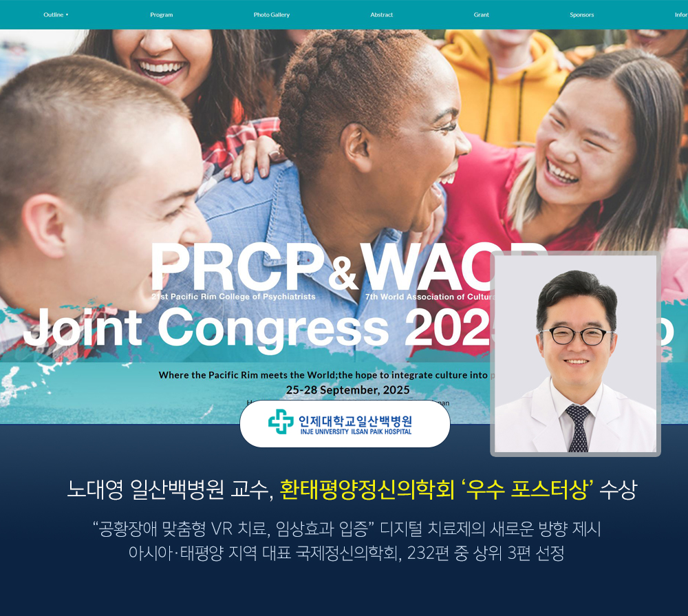 인제대학교 일산백병원 정신건강의학과 노대영 교수가 최근 일본 도쿄에서 열린 ‘제21회 환태평양정신의학회(The 21th Pacific Rim College of Psychiatrist, PRCP 2025)’에서 우수 포스터상(Outstanding Poster Presentation Award)을 수상했다.