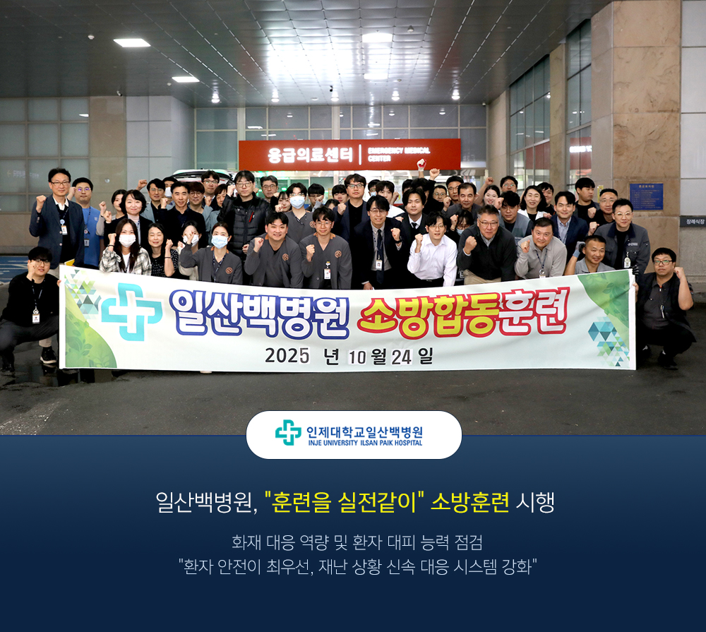 일산백병원은 정기적으로 화재, 재난, 응급상황 등을 대비한 전 직원 참여형 모의훈련을 실시하고 있으며, ‘환자 안전 최우선 병원’을 목표로 선제적 위기 대응 체계를 지속적으로 고도화하고 있다.