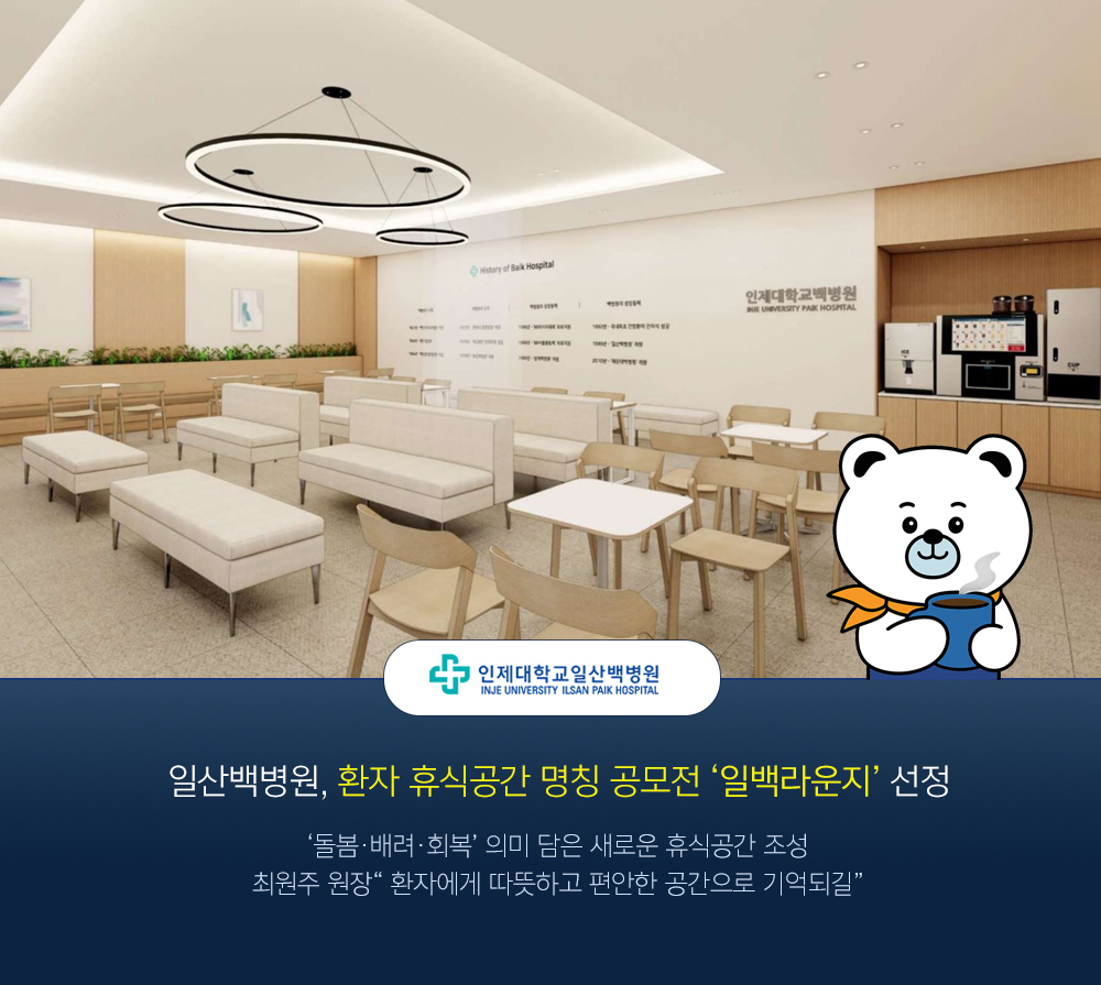 최원주 원장은 “이번 명칭 공모전은 단순히 공간의 이름을 정하는 절차가 아니라, 병원 구성원 모두가 환경 개선과 환자 경험 향상에 직접 참여한 의미 있는 과정이었다”며, “‘일백라운지’가 환자와 보호자가 편히 머물며 심리적 안정과 회복의 시간을 가질 수 있는 따뜻한 휴식공간으로 자리매김하길 기대한다”고 전했다.