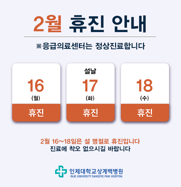 2026년 2월 16~18일은 설 명절로 휴진입니다.