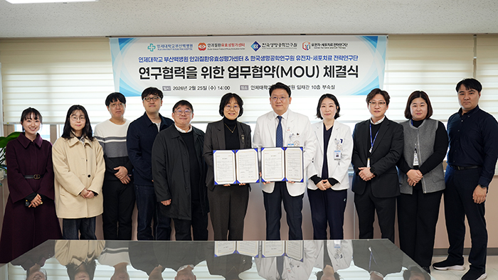 인제대학교 부산백병원(원장 양재욱)이 2월 25일(수) 한국생명공학연구원 유전자·세포치료 전략연구단(단장 정경숙)과 공동연구 추진을 위한 업무협약을 체결했다.