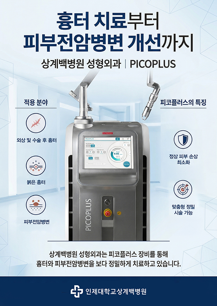 인제대학교 상계백병원(원장 배병노) 성형외과는 최근 최첨단 레이저 장비 ‘피코플러스(PICOPLUS)’를 도입한 이후, 흉터 치료와 피부전암병변 치료에 활발히 활용하고 있다.