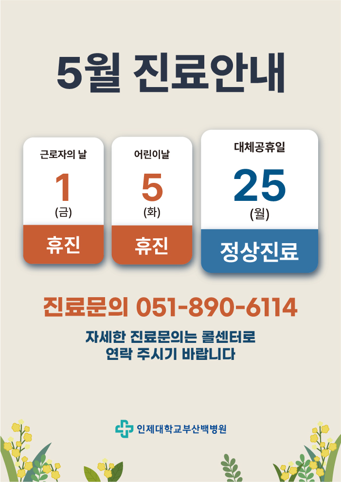 [5월 진료안내] 5/1(금), 5/5(화) 휴진|5/25(월) 정상진료