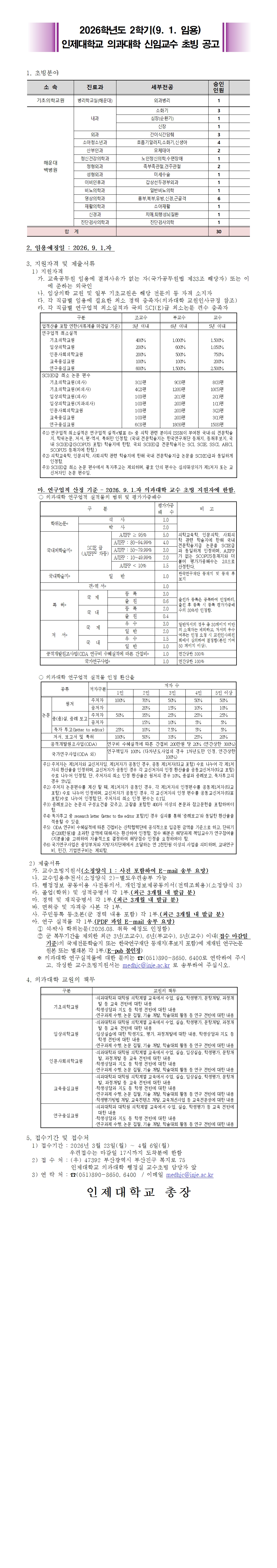 1765. 2026학년도 2학기(9.1임용) 인제대학교 의과대학 신임교수 초빙 공고