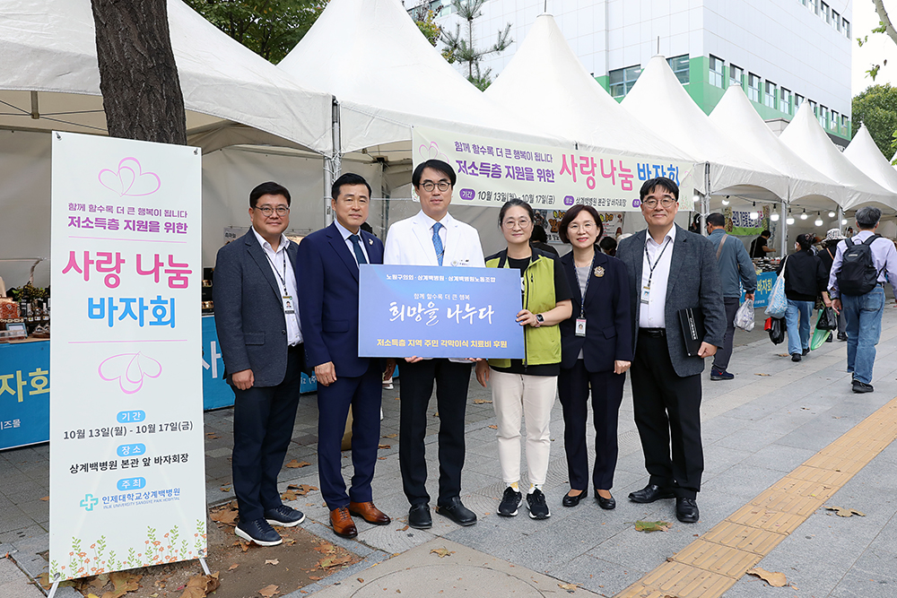 상계백병원과 노동조합은 지난 10월 13일부터 17일까지 5일간 본관 앞 바자회장에서 ‘저소득층 지원을 위한 사랑나눔 바자회’를 열고, 행사 수익금을 치료비 지원에 사용하기로 했다.이번 행사는 ‘지역과 함께하는 따뜻한 병원’을 만들기 위해 병원과 노조가 공동으로 마련한 사회공헌 활동이다.
